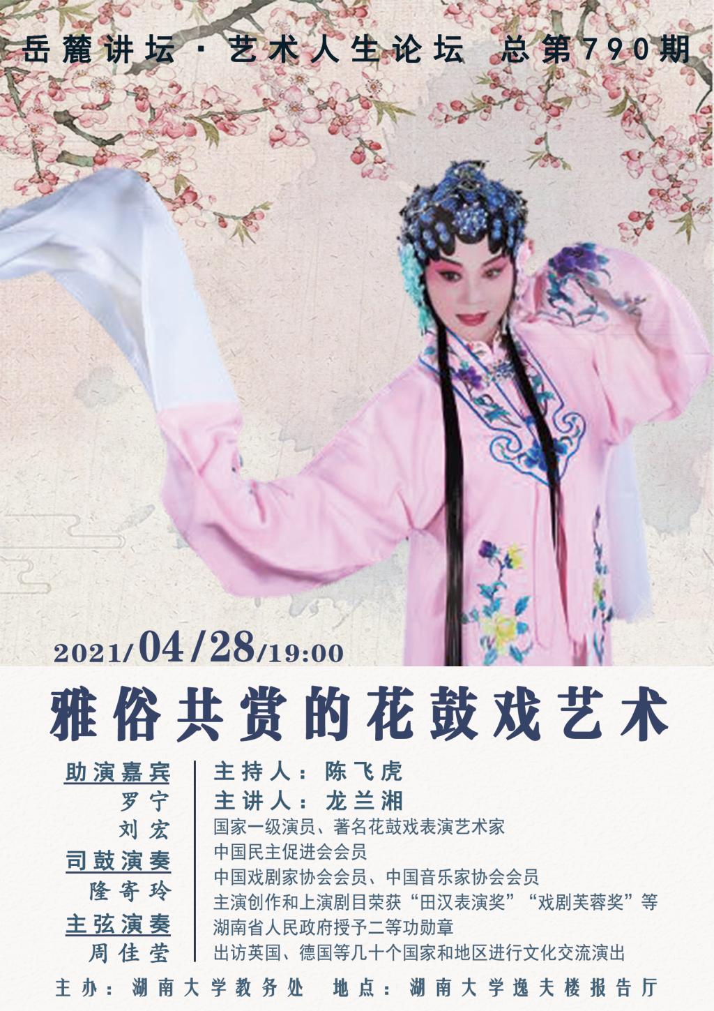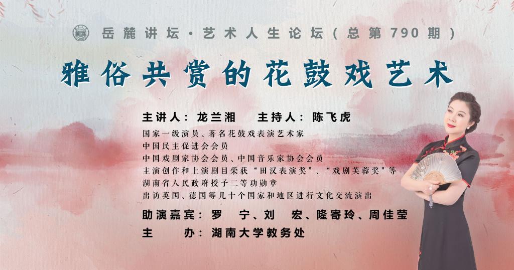 主講人:龍蘭湘(國家一級演員,著名花鼓戲表演藝術家,中國民主促進會會員,中國戲劇家協會會員、中國音樂家協會會員,主演創作和上演劇目榮獲《田漢表演獎》《戲劇芙蓉獎》等獎項,湖南省人民政府授予二等功勛章,出訪英國、德國等幾十個國家和地區進行文化交流演出)