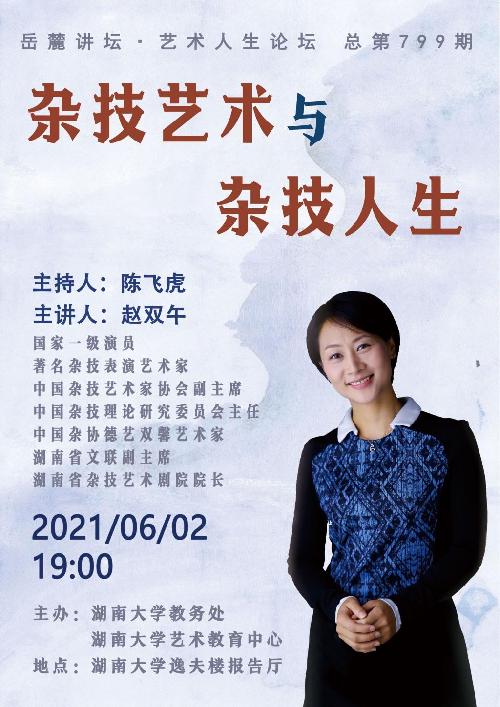 主講人:趙雙午(國家一級演員,著名雜技表演藝術家,中國雜技藝術家協會副主席,中國雜技理論研究委員會主任,中國雜協徳藝雙馨藝術家,湖南省文聯副主席,湖南省雜技藝術劇院院長)